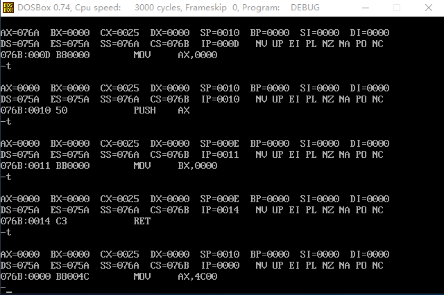 assume cs:code stack segment db 16 dup (0) stack ends code segment mov ax,4c00H int 21H start: mov ax,stack mov ss,ax mov sp,16 mov ax,0 push ax mov bx,0 ret code ends end start