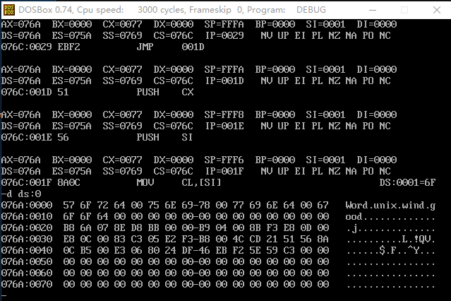 assume cs:code data segment db 'word',0 db 'unix',0 db 'wind',0 db 'good',0 data ends code segment start: mov ax,data mov ds,ax mov bx,0 mov cx,4 s: mov si,bx call capital call change add bx,5 loop s mov ax,4c00h int 21h capital: push cx push si change: mov cl,[si] mov ch,0 jcxz ok and byte ptr [si],11011111b inc si jmp short capital ok: pop si pop cx ret code ends end start