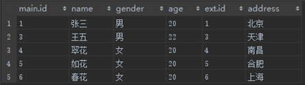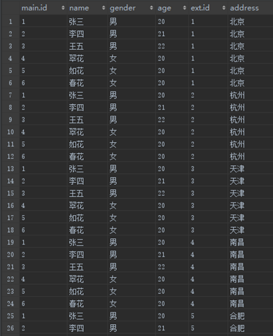第二步,应用on筛选器。筛选器中有两个条件,main.id = ext.id and address<> '杭州',符合要求的记录如下。