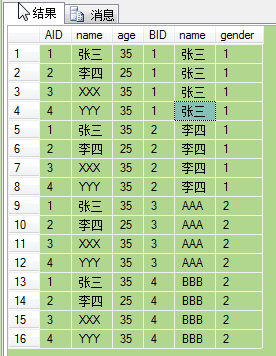 把表A和表B的数据进行一个N*M的组合,即笛卡尔积。如本例会产生4*4=16条记录,在开发过程中我们肯定是要过滤数据,所以这种很少用。