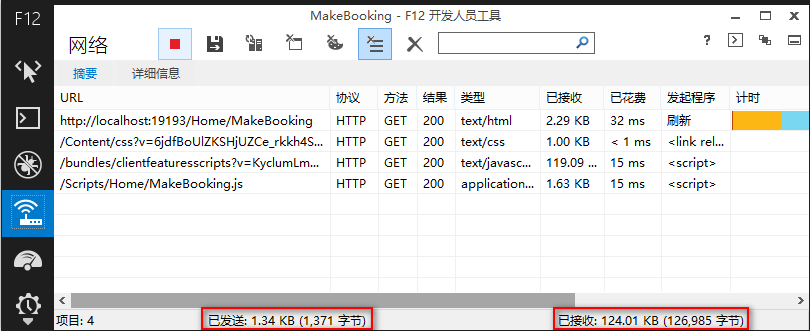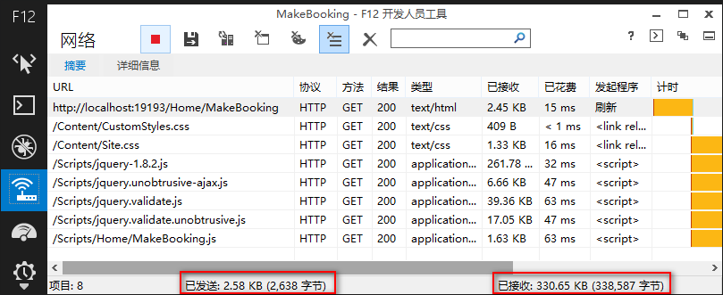 我们再来看看使用捆绑带宽的使用情况。我们把之前在 MakeBooking.cshtml 和 _Layout.cshtml 中的注释去掉,并把 _Layout.cshtml 引入 7 个文件的代码删除。