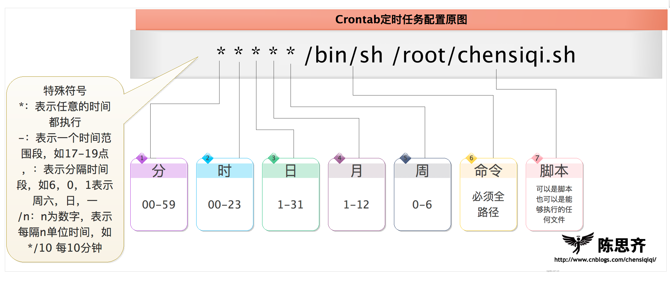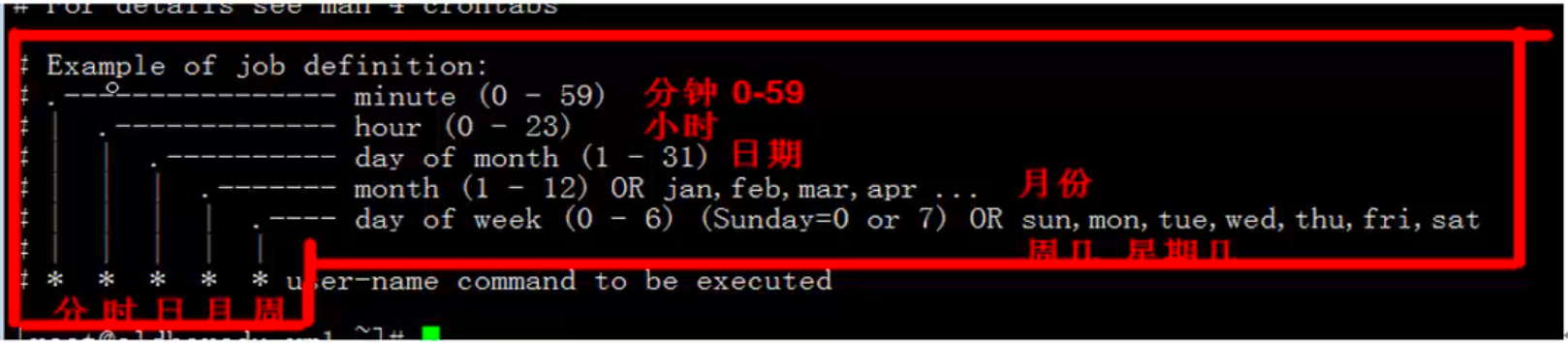 Crontab定时任务的书写格式很简单,用户的定时任务规则一般分为6个段(每个段通过空格来分隔,系统的定时任务为/etc/crontab,分为7个段,空格来分隔),前五段为时间的设定段,第六段为所要执行的命令或脚本任务段