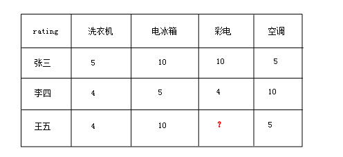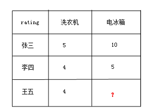 在这个图中,系统该如何计算“王五“对”电冰箱“的打分值呢?刚才我们也说了,slopeone是采用均值化的思想,也就是:R王五 =4-{[(5-10)+(4-5)]/2}=7 。