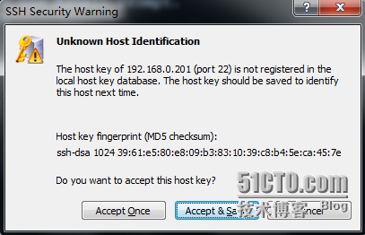 [root@Server-A~]# ssh 192.168.0.201 Theauthenticity of host '192.168.0.201 (192.168.0.201)' can't be established. RSAkey fingerprint is 4c:a3:2f:29:69:86:f6:0f:38:25:8c:7c:7c:3b:d5:91. Areyou sure you want to continue connecting (yes/no)?