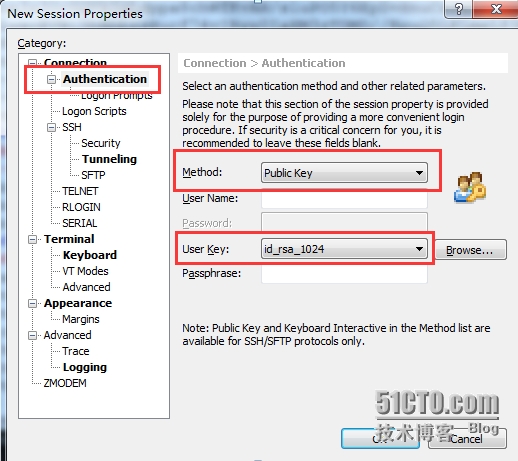 2、在“Authentication”中填写认证方式和私钥,如下图: