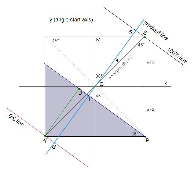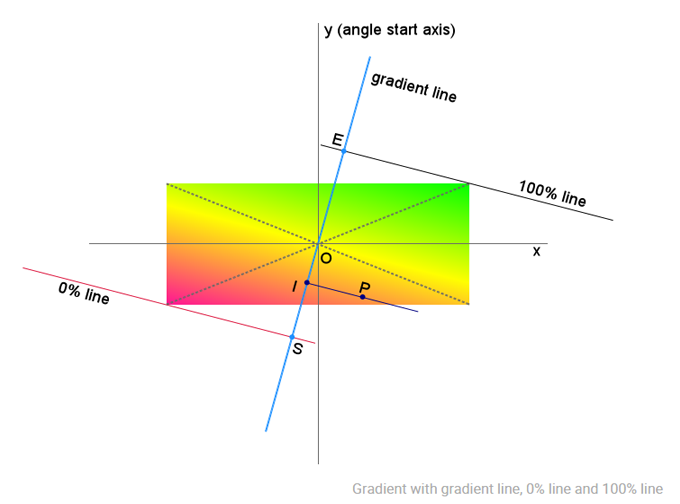 与梯度垂直的线上的所有点的颜色。从第三象限的顶点引出的垂直与梯度的直线是0% line,从第一象限的顶点引出的垂直线是100% line。画一条经过原点、且与0% line和100% line垂直的直线,与0% line交点为S,与100% line交点为E,在长方形内任取一点P,假设这点在颜色变化的分界线上,从点P做一条垂直于直线SE的线,垂点为I;线段SI和SE的比值为P点所在分界线分开的面积占整个面积的比例。