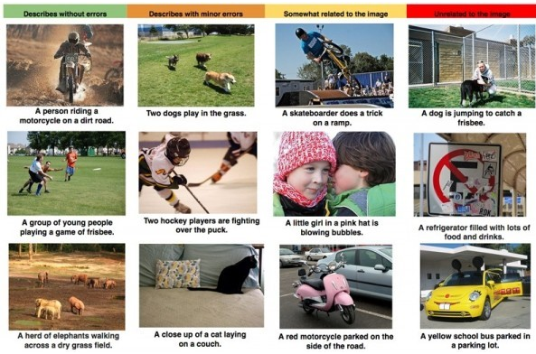 来自Google研究院的科学家发表了一篇博文,展示了Google在图形识别领域的最新研究进展。或许未来Google的图形识别引擎不仅能够识别出图片中的对象,还能够对整个场景进行简短而准确的描述。这种突破性的概念来自机器语言翻译方面的研究成果:通过一种递归神经网络(RNN)将一种语言的语句转换成向量表达,并采用第二种RNN将向量表达转换成目标语言的语句。