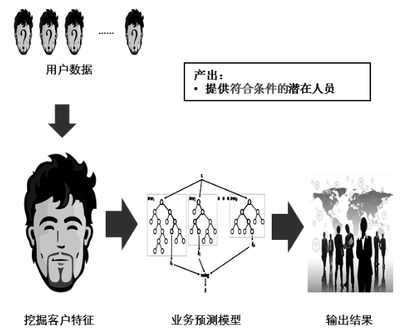 下图是一个典型的推荐类应用,需要找到“符合条件的”潜在人员。要从用户数据中得出这张列表,首先需要挖掘出客户特征,然后选择一个合适的模型来进行预测,最后从用户数据中得出结果。