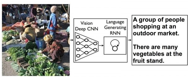 而Google将以上过程中的第一种RNN用深度卷积神经网络CNN替代,这种网络可以用来识别图像中的物体。通过这种方法可以实现将图像中的对象转换成语句,对图像场景进行描述。概念虽然简单,但实现起来十分复杂,科学家表示目前实验产生的语句合理性不错,但距离完美仍有差距,这项研究目前仅处于早期阶段。下图展示了通过此方法识别图像对象并产生描述的过程。
