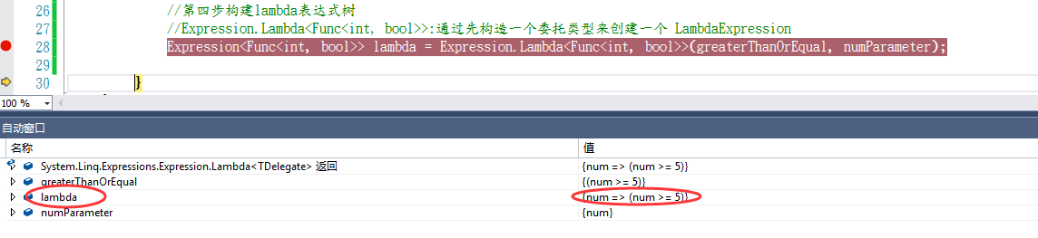 上面的代码意思就以表达式目录树的形式将强类型的lambda表达式num=>num>=5标识为数据结构。