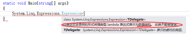 1 static void Main(string[] args) 2 { 3 System.Linq.Expressions.Expression<Func<int, bool>> lambda = num => num >= 5; 4 }
