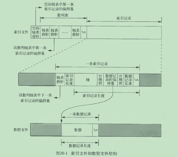 若db_open成功返回,则建立两个文件:pathname.idx(索引文件)和pathname.dat(数据文件)。第二个参数指定文件的打开模式。若建立新数据库文件,mode将作为第三个参数传递给open。