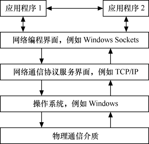 Windows Sockets规范定义并记录了如何使用API与Internet协议族(IPS,通常是指TCP/IP)连接,尤其要指出的是,所有的Windows Sockets实现都支持流套接接口和数据报套接接口,应用程序调用Windows Sockets的API实现相互之间的通信。Windows Sockets又利用下层的网络通信协议功能和操作系统调用实现实际的通信工作。它们之间的关系如下图所示。