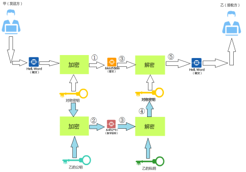 数字信封的加/解密过程如图1-19所示。甲也要事先获得乙的公钥,具体说明如下(对应图中的数字序号):
