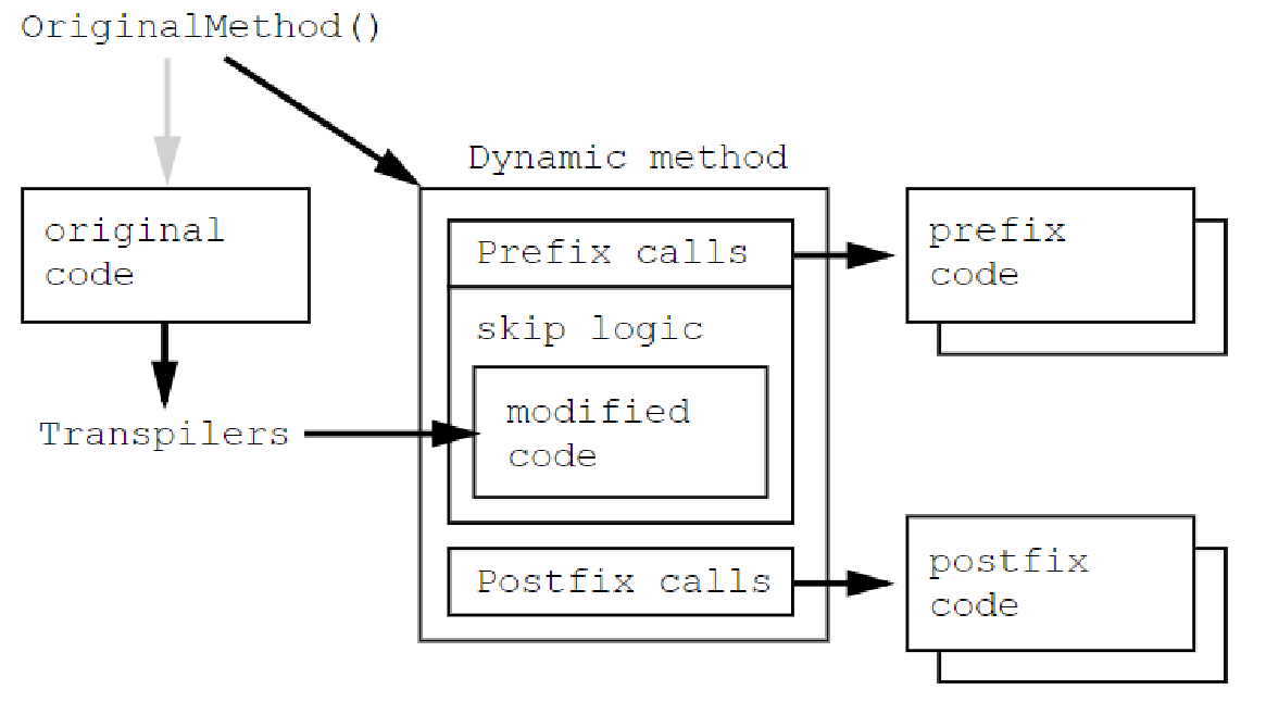 前缀补丁和后缀补丁非常好理解,就是我们理解的 AOP 功能,前者在原始方法执行前执行,后者是在原始方法执行后执行。