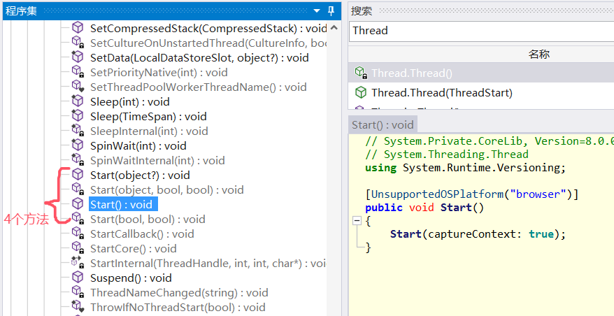 到这里我相信有很多人都有一个疑惑,对 thread.Start(); 方法的注入点在哪里?要想找到这个答案,可以简单粗暴看汇编即可。