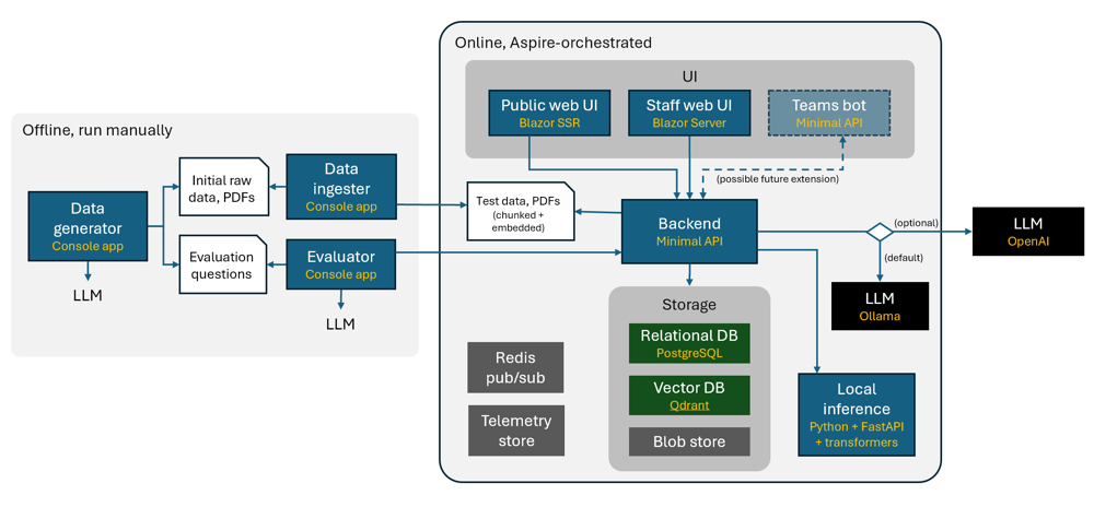 eShopSupport 是一个面向电子商店客户支持的参考 .NET 应用,采用服务化架构,将不同功能划分为多个模块/子项目并通过 .NET Aspire 进行统一编排。整体架构包括离线数据工具、在线后端服务、前端应用以及基础设施服务几大部分: