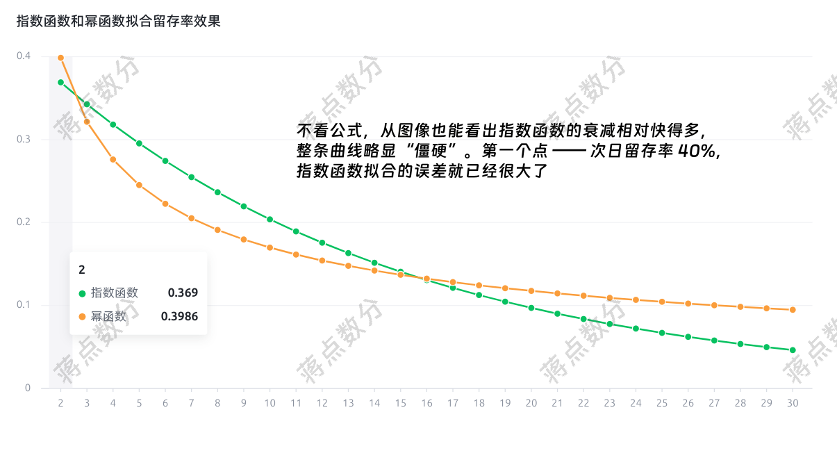 "title": {"visible": True, "text": "指数函数和幂函数拟合留存率效果"},