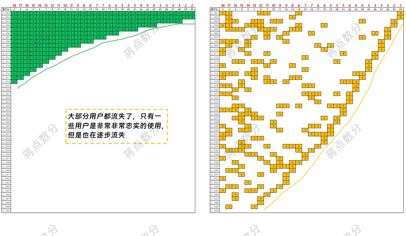 此处再对比,应该明显多了。如果我们把最后一次活跃。当成一种“包络线”来看,后者的情况要比第一种极端情况好得多。但是两者的留存率曲线是一样。图片表格最上面的红色数字,就是公式,对表格里整列的 1 求和;可以佐证每日留存用户数是一样的。