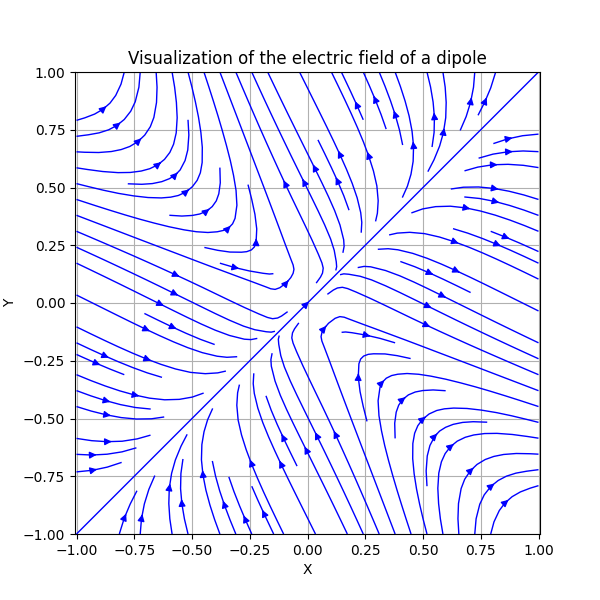 运行上述代码后,你将看到一个图像,显示偶极子周围的电场线。你会发现,电场线在偶极子附近呈现出对称分布,并且朝向偶极子的正负电荷分布情况。通过可视化,我们能够更好地理解偶极子电场的结构和变化。