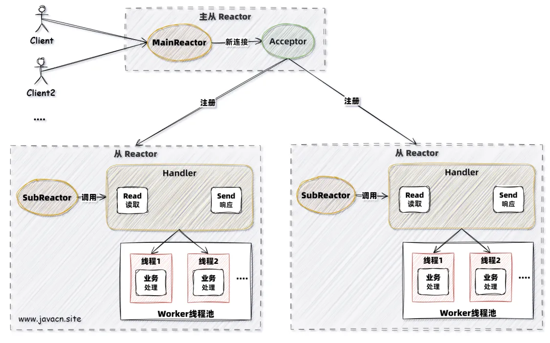 - 主从 Reactor 模型:主线程池处理连接,子线程池处理 I/O(进一步优化资源分配)。