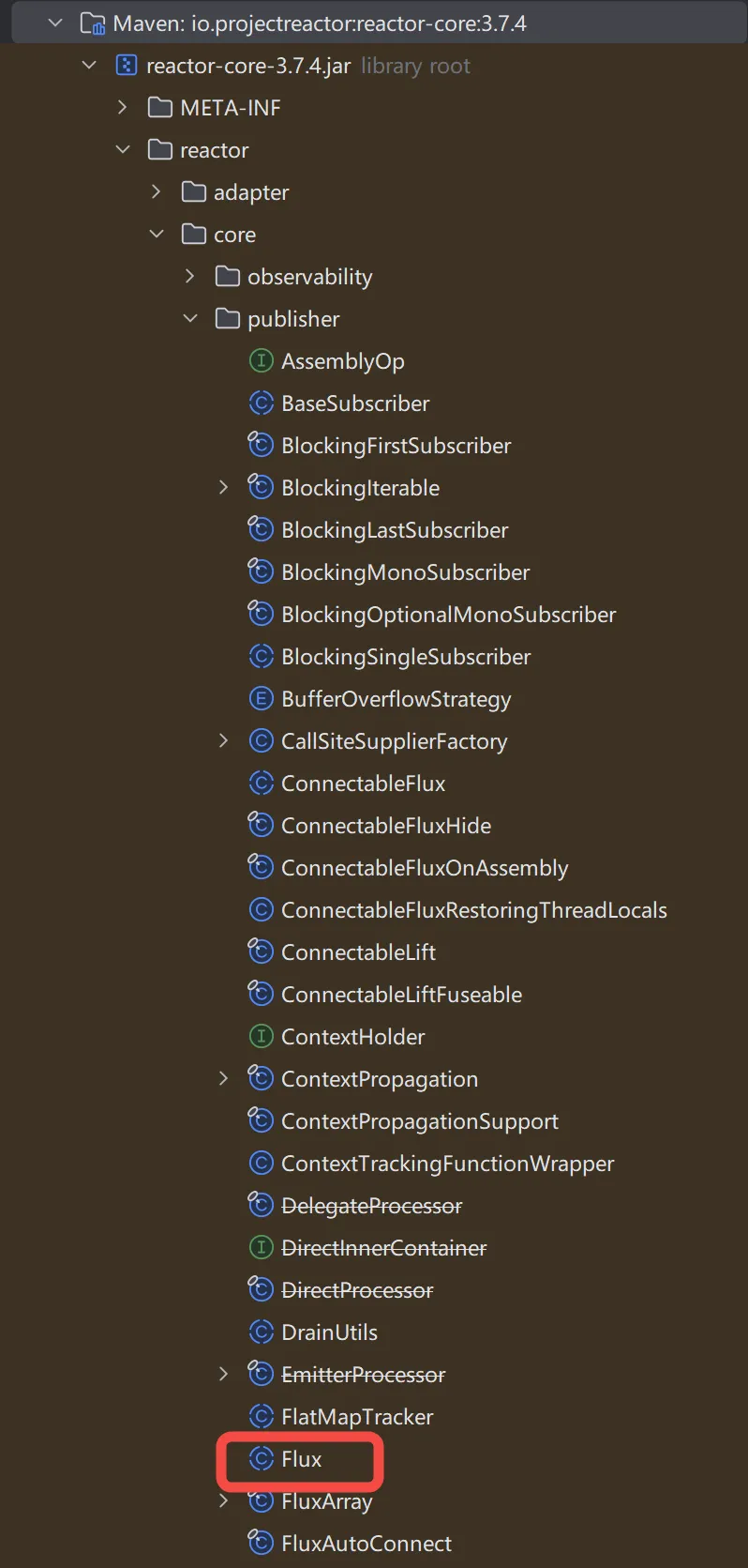 要搞清楚这个问题,我们需要看流式输出对象 Flux 的实现源码: