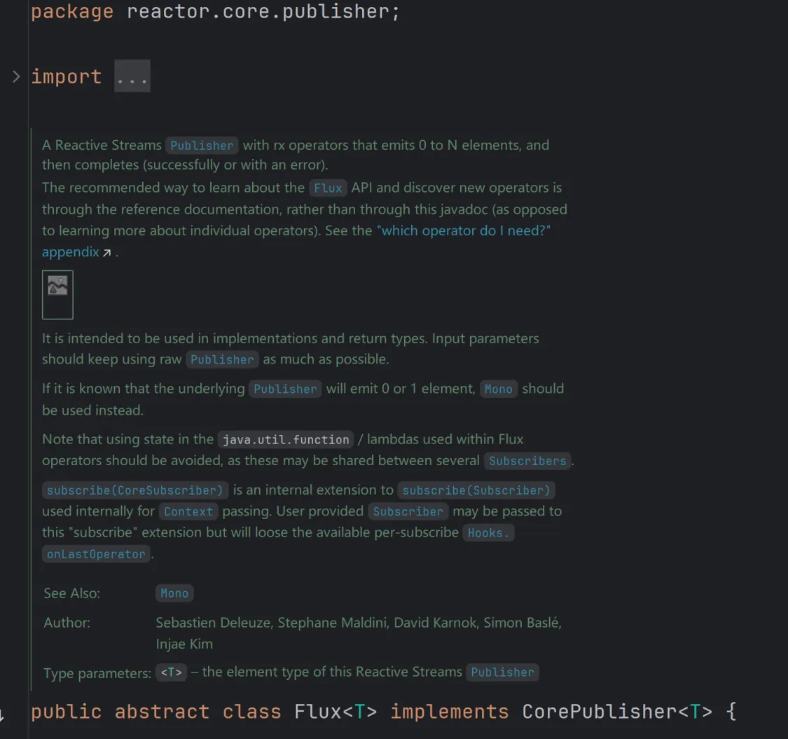 查看 Flux 源码我们发现它是属于 reactor.core.publisher 包下的抽象类: