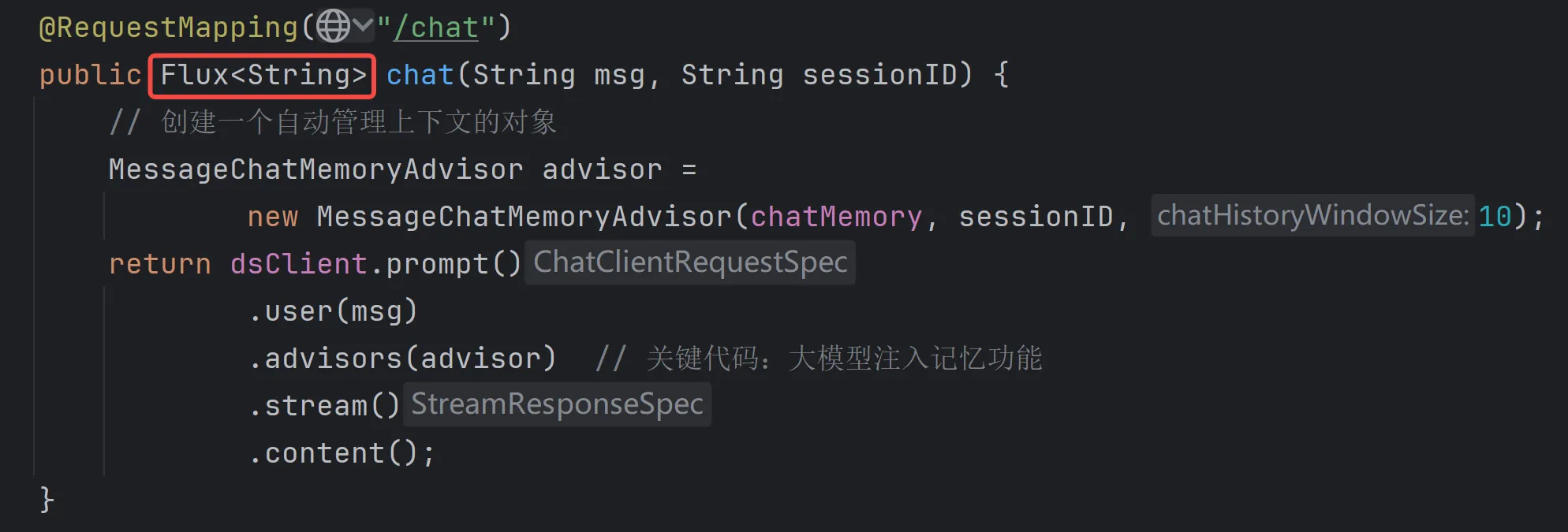 public Flux<String> streamChat(@RequestParam(value = "msg") String msg) {