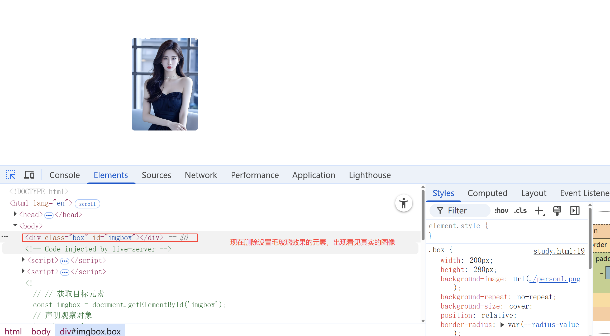 我们的背景图是插入在 <div class="box" id="imgbox"> 这个元素上的