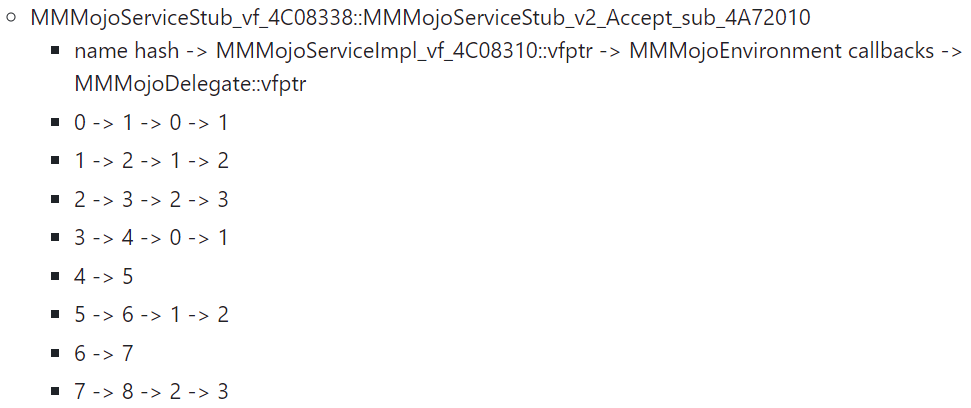 比较简单常用的是MMMojoService::0, MMMojoService::1两个方法,分别对应MMMojoDelegate::OnReadPush,MMMojoDelegate::OnReadPull。这里说明一下,Service的每个method都有一个hashname,salt不同编译出来的hashname也不会相同。这里归约成hashname表的序号。MMMojoService::0就是第一个method。