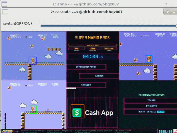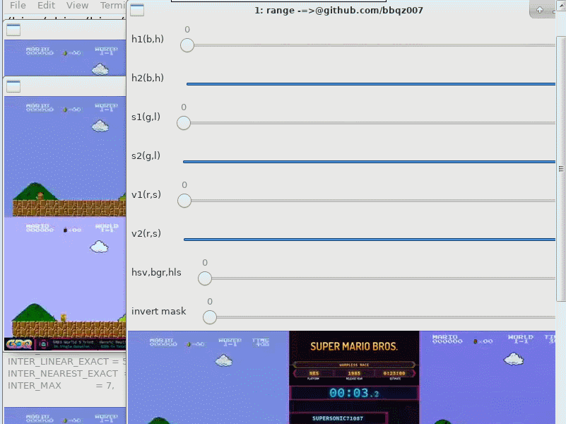 还写了一个opencv工具,zhelper-cvtool,用FilterPipeline模式,调试视觉识别流程中,图像处理流中各个滤镜环节的参数,识别方法如match,cascade,blob,feature等封装成输出滤镜。例如命令”cvtool Mario/%04d.png pyrDown,pyrUp,morphology,channel,canny,contours", 将图片Mario/%04d.png集合作为输入流,contours识别算法为输出滤镜,中间经过多个图像滤镜处理,以产生适合识别算法的图像。最后识别滤镜将识别结果与输入源原图进行混合。每个滤镜都有一个单独窗口,可以调整参数,同时同步实时生成每个滤镜的处理完的图像结果。