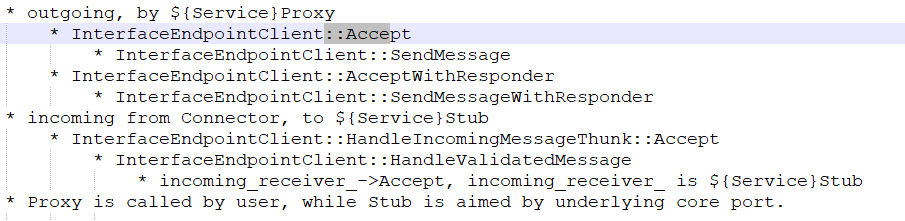 从Connector开始,往上所有参与的类皆是MessageReceiver。MessageReceiver使用了责任链模式,用虚函数MessageReceiver::Accept传递责任并处理Message。Connector对应着一个MessagePipe以及它的SimpleWatcher。它既代表一个底层通信MessagePipe的连接,同是也是底层跟Binding上层承接的连接点。Remote跟Receiver都是一个InterfaceEndpointClient。当一个InterfaceEndpointClient没有incoming_receiver_时,它角色则是Remote,是ServiceProxy的receiver_,这时InterfaceEndpointClient::Accept负责发送,注意的是Accept的责任来自上层的Proxy。相反地,当有incoming_receiver_时,它角色则是Receiver,并且incoming_receiver_就是ServiceStub。这时InterfaceEndpointClient::Accept直接将责任传递给ServiceStub,Accept责任来自底层的SimpleWatcher通知。