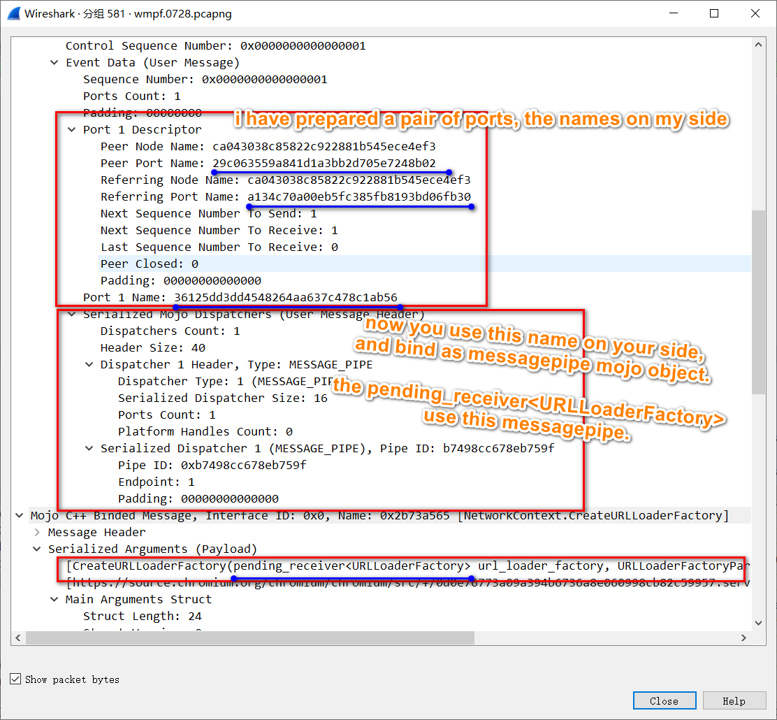 remote或receiver的传递或者返回,是通过MergePort来实现。下图是CreateURLLoaderFactory方法如何返回一个pending_receiver<URLLoaderFactory>的。