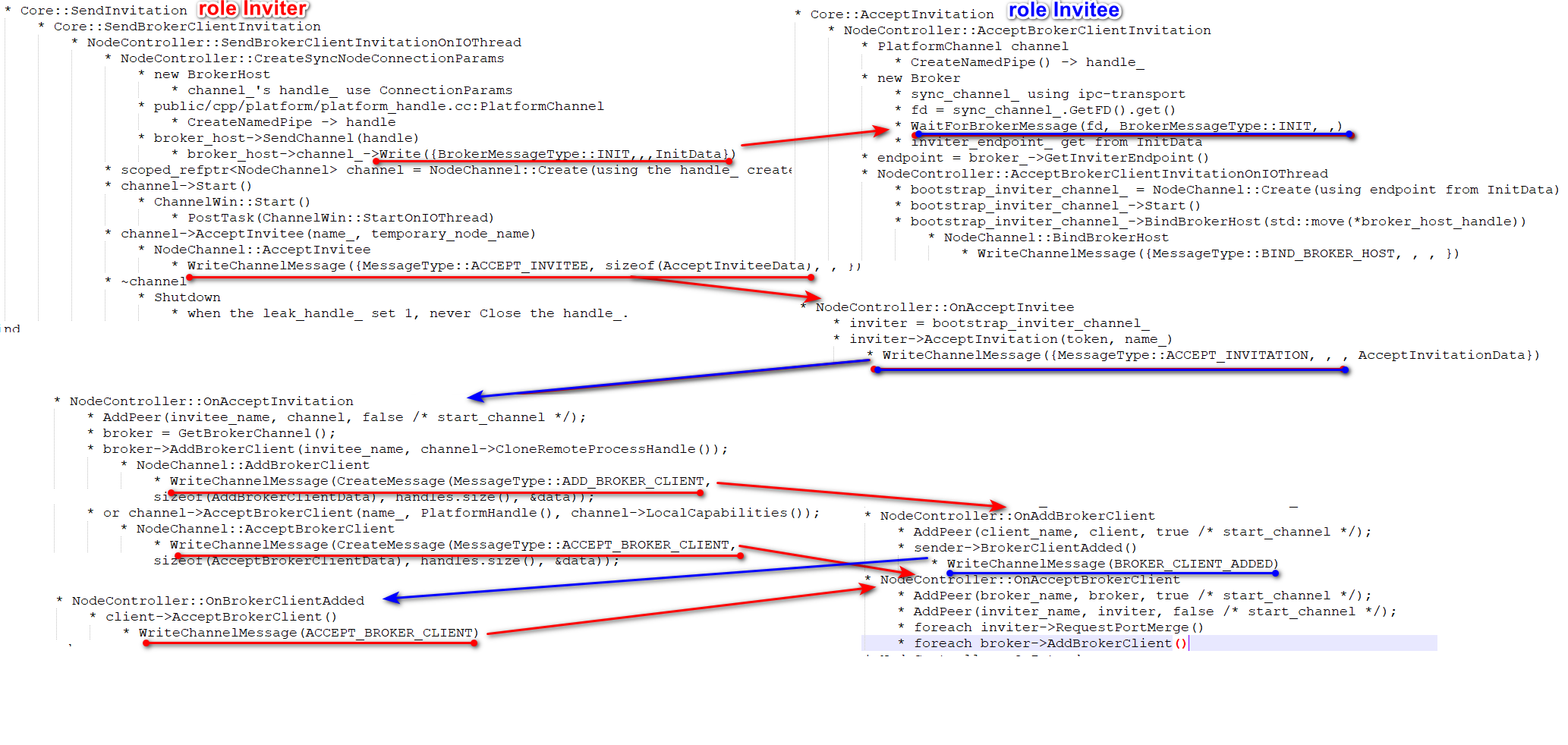 Invitation使用MojoAttachMessagePipeToInvitation跟MojoExtractMessagePipeFromInvitation,附加在Invitation握手流程。MessagePipe使用MojoAppendMessageData跟MojoGetMessageData,附加在一次Message传递。