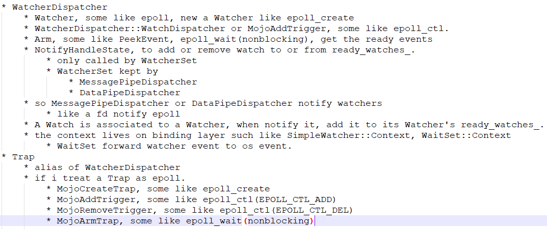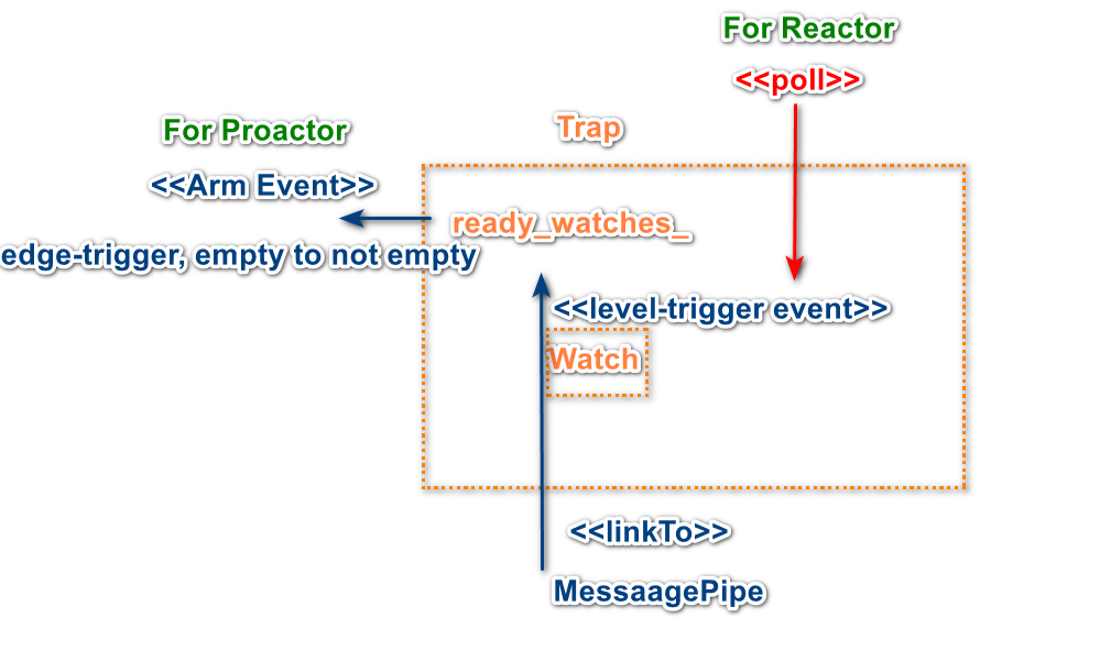 类似地,Trap让与确立事件关联的MessagePipe或DataPipe,将触发的事件添加到它的ready_watches_,用户藉由MojoArmTrap将事件取出。