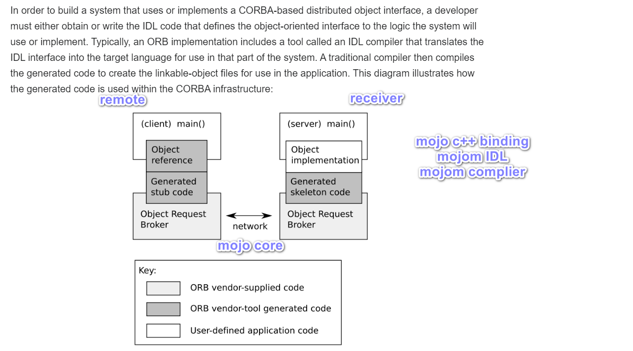 我认为mojo是使用了orb架构,google了一下没有人这么说,那只能是我个人观点了,没有权威背书。或者换一种说法,可以orb架构来认识mojo,mojo中有许多orb架构的东西,但mojo只能用于本地机器的进程间,不是中间件。