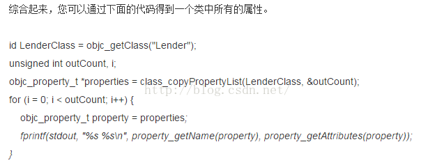 您可以使用函数class_copyPropertyList和protocol_copyPropertyList来获得类(包括范畴类)或者协议类中的属性列表: