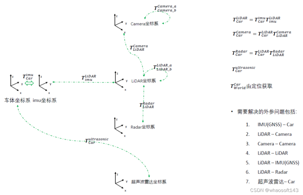多传感器融合感知~外参标定及在线标定学习 作为无人车以及智能机器人而言,在装配过程中各个传感器之间的外参标定一直是比较头疼的问题。这里作者也系统的学习了一下,传感器的外参标定和在线标定问题。下图是我们常用的几个坐标系,而对于常用的外参问题经常是IMU/GNSS与车体坐标的外参、Lidar和Camera的外参、Lidar和Lidar的外参、Lidar和IMU/GNS...