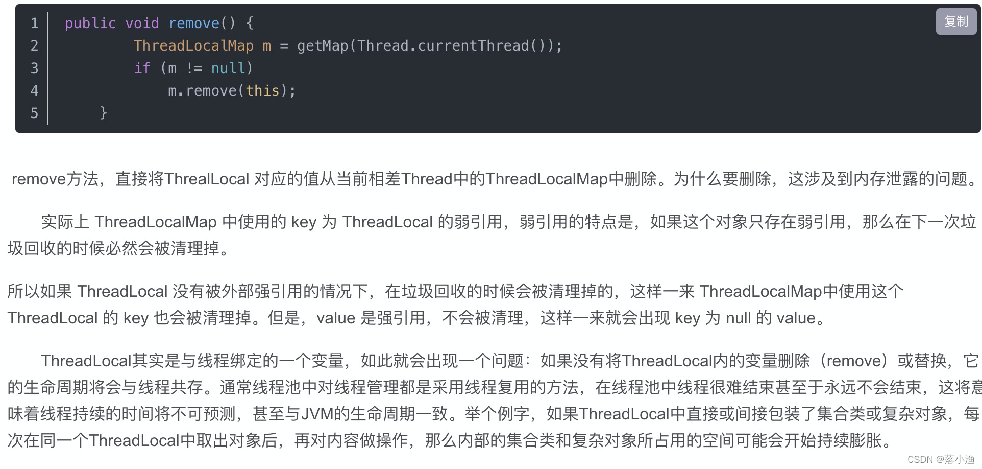 public T get() { //1、获取当前线程 Thread t = Thread.currentThread(); //2、获取当前线程的ThreadLocalMap ThreadLocalMap map = getMap(t); //3、如果map数据为空, if (map != null) { //3.1、获取threalLocalMap中存储的值 ThreadLocalMap.Entry e = map.getEntry(this); if (e != null) { @SuppressWarnings("unchecked") T result = (T)e.value; return result; } } //如果是数据为null,则初始化,初始化的结果,TheralLocalMap中存放key值为threadLocal,值为null return setInitialValue(); } private T setInitialValue() { T value = initialValue(); Thread t = Thread.currentThread(); ThreadLocalMap map = getMap(t); if (map != null) map.set(this, value); else createMap(t, value); return value; }