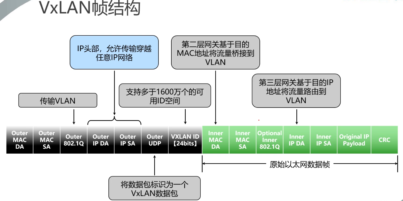 VxLAN 1、VxLAN帧结构二层数据封装2、VxLAN头部封装3、VxLAN关键技术术语VNI【Virtual Network Instance|虚拟网络实例】:类似于 VLAN 实例,表征着一种服务(Service)VNID【虚拟网络标识符】: 类似于 VLAN IDNVE【网络虚拟边界】: 起 VxLAN 隧道的设备称之为 N...