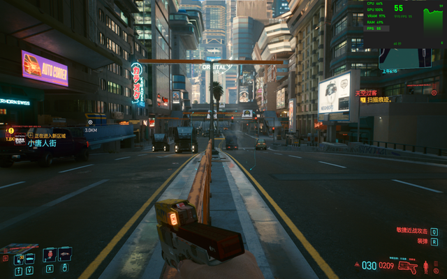 最后一款游戏是《赛博朋克 2077》,在 1920*1200 分辨率最高画质下,不开光追帧率可以稳定在 60-70 帧,游戏体验不错。