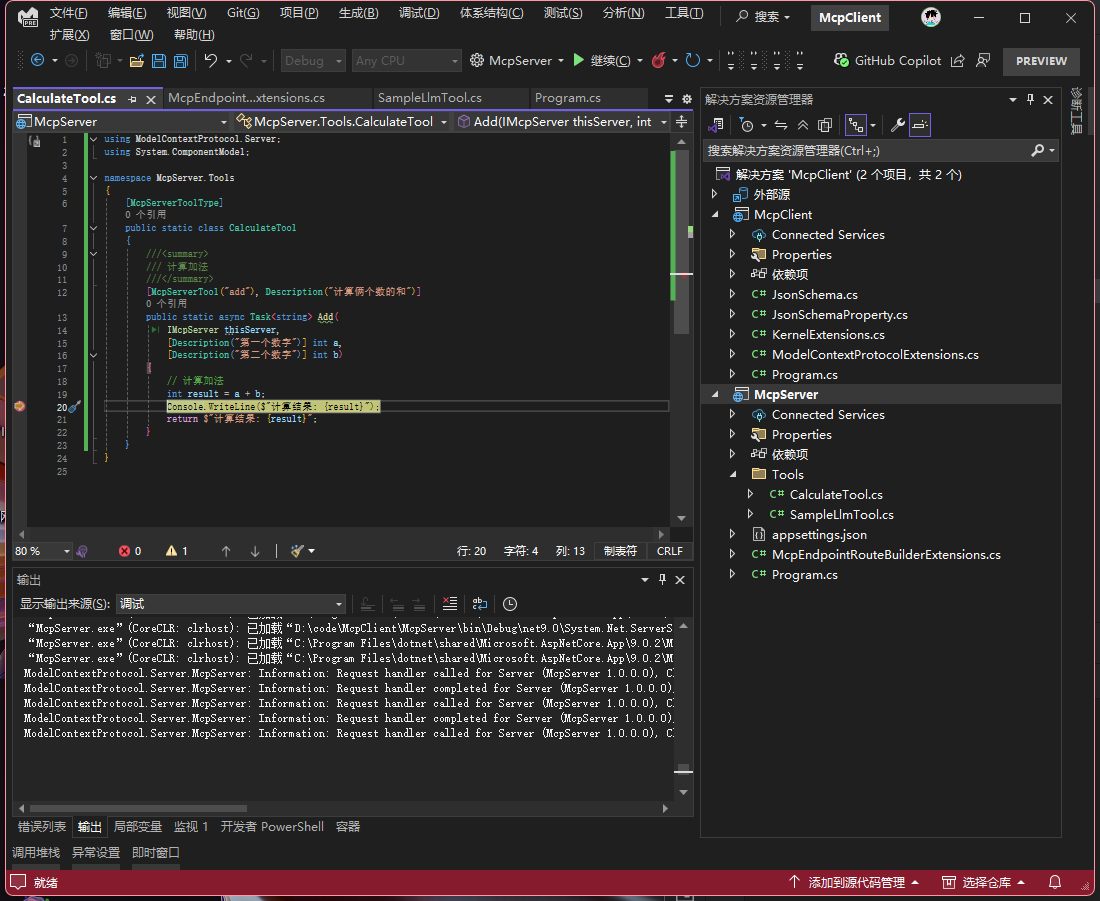 在执行之前我们可以先在MCPServer中的算法函数Debug,这样就可以清晰的看到进入的流程了
