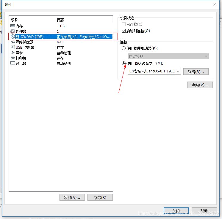 进去自定义硬件之后,要在CD/DVD里面,选择使用ios映像文件,浏览选择centos8的镜像。