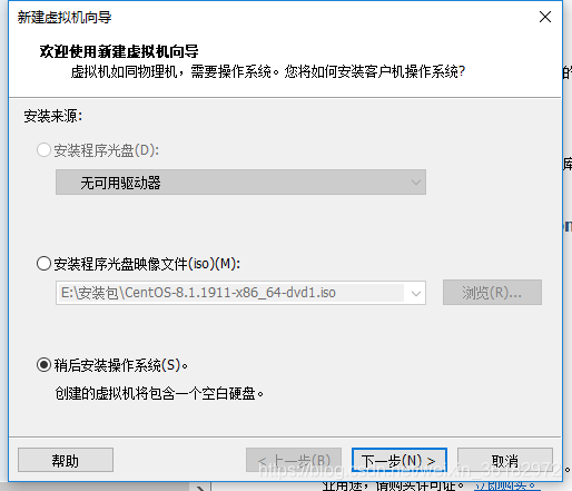 这里需要注意,可能兼容性还不够,如果镜像是centos8,选择“安装程序光盘映像文件”,会识别成centos5和更早的版本,所以我们还是选择“稍后安装操作系统”,然后一步步配置安装。centos7是没有这个问题的。