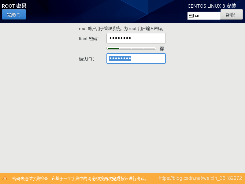 点击开始安装,会出现以下页面。在这个页面中配置root和管理员用户。