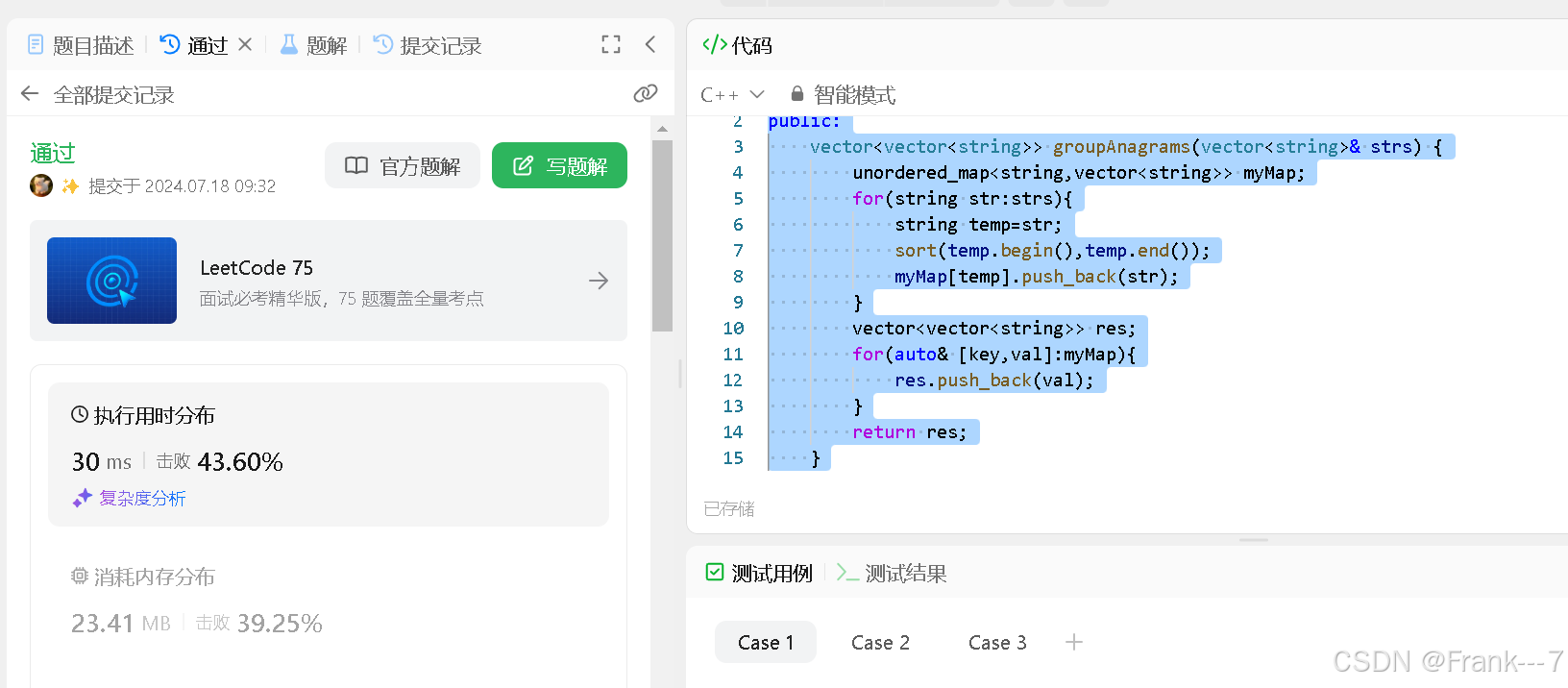 思路展示由于互为字母异位词的两个字符串包含的字母相同,因此对两个字符串分别进行排序之后得到的字符串一定是相同的(但是两个字符串分别排序时,不能改变原字符串,所以要用一个temp字符串来存储原字符串然后再进行排序),故可以将排序之后的字符串作为哈希表的键。示例代码登录后复制 class Solution {public:...