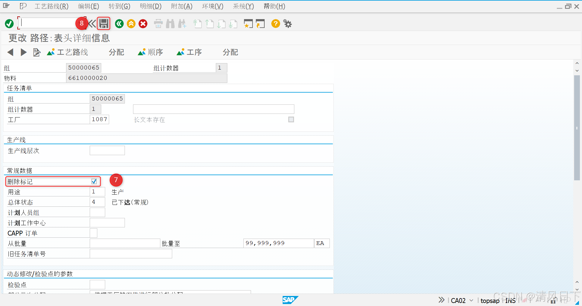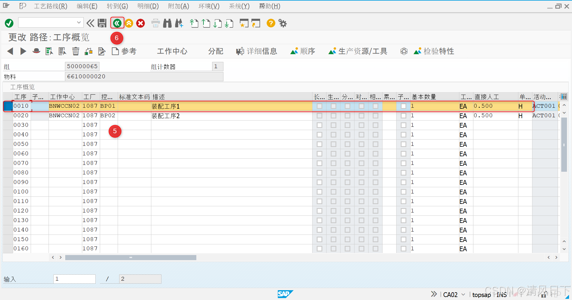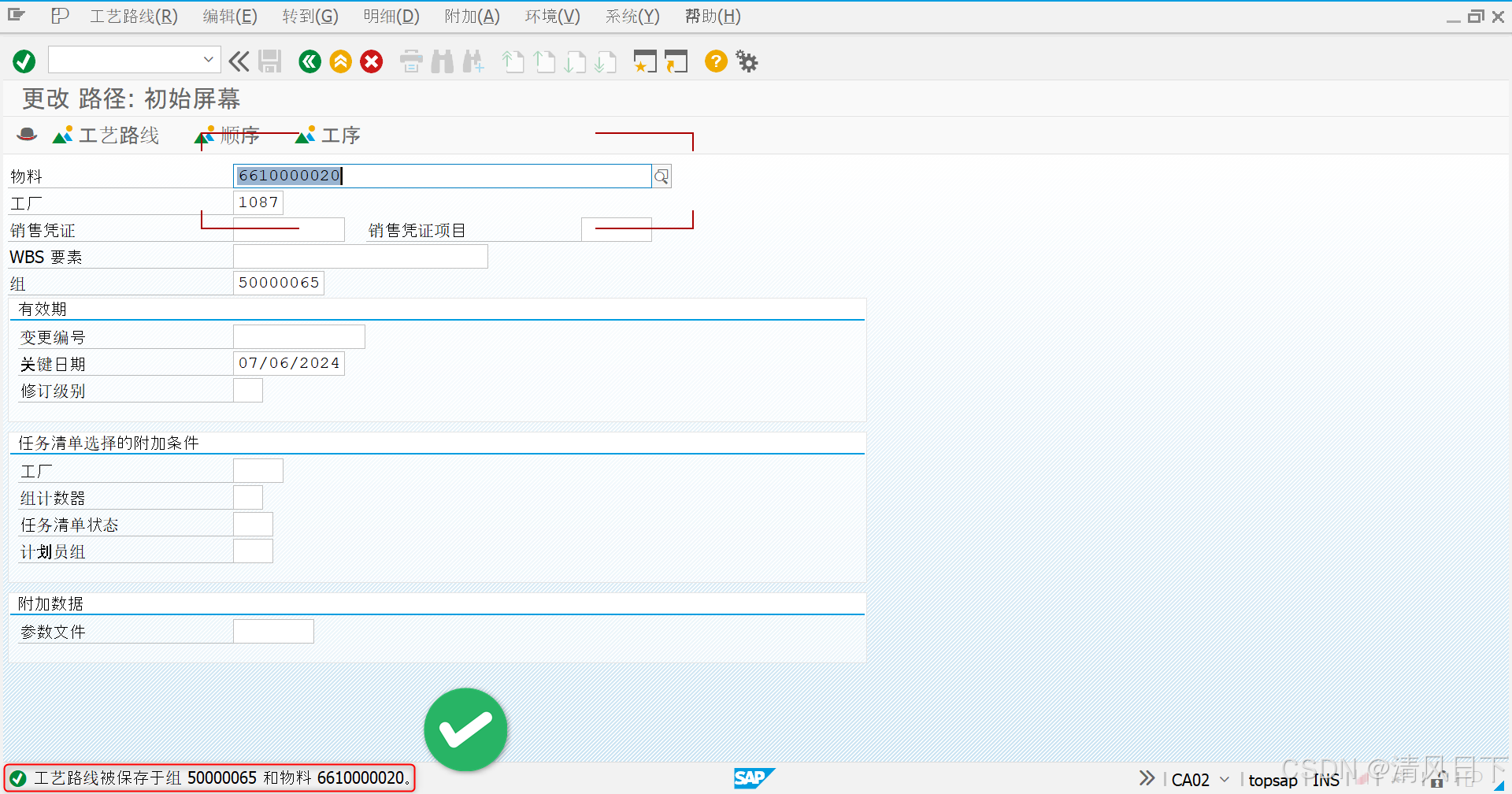 工艺路线只需要针对于需要生产的自制件物料6610000020进行创建即可。