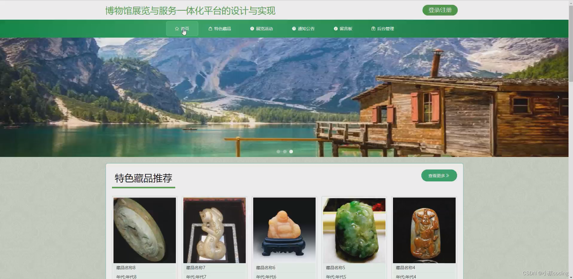 基于SpringBoot+Vue的博物馆展览与服务一体化平台的详细设计和实现(源码+lw+部署文档+讲解等)... 文章目录前言详细视频演示具体实现截图技术栈后端框架SpringBoot前端框架Vue持久层框架MyBaitsPlus系统测试系统测试目的系统功能测试系统测试结论为什么选择我自己的网站自己的小程序(小蔡coding)代码参考数据库参考源码获取 前言????博主介绍:✌全网粉丝10W+,特邀作者、博客专家、新星计划导师、全栈领域优...