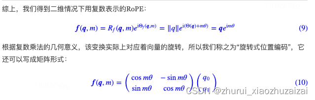 相当有意思的是,内积只依赖于相对位置m−n!这就巧妙地将绝对位置与相对位置融合在一起了由上述结果可知,对于位置为n的二维实数向量[x,y],我们当它复数来运算,乘以einθ,得到恒等式