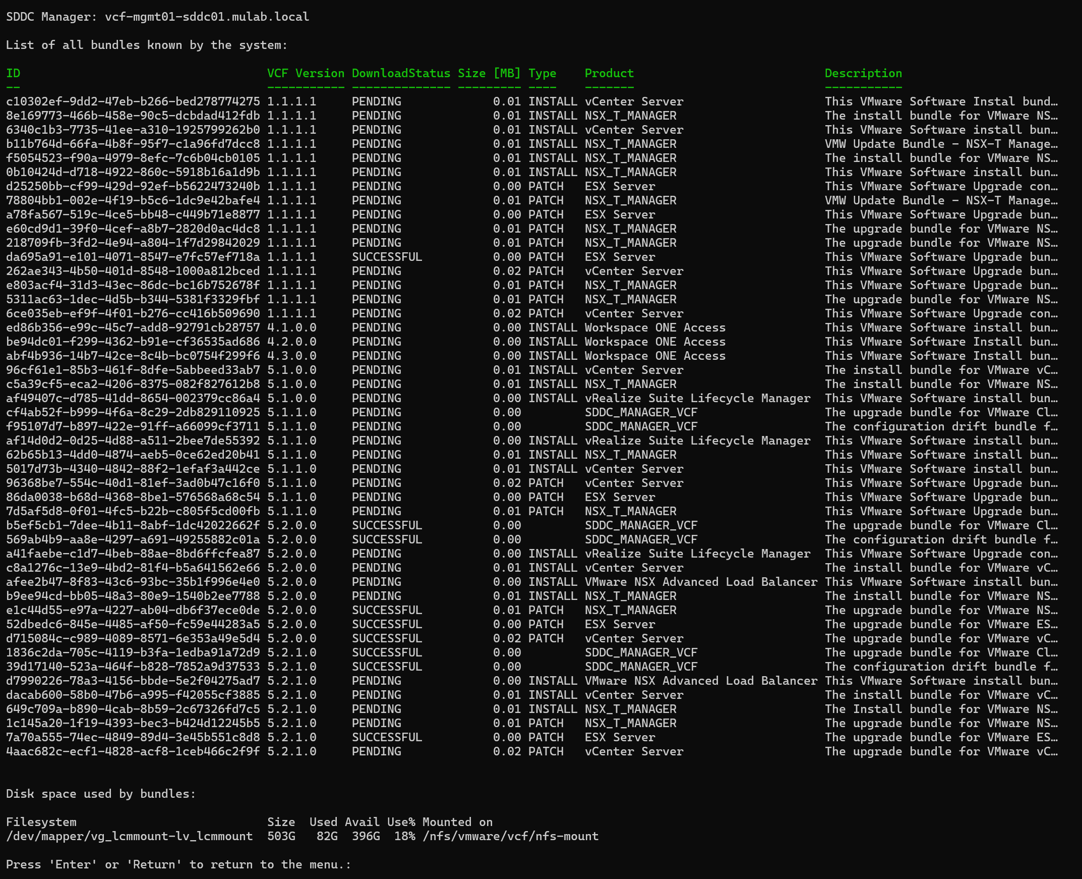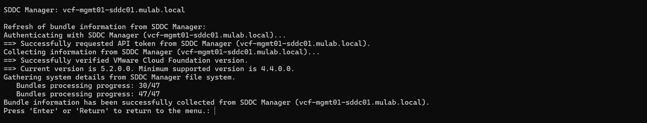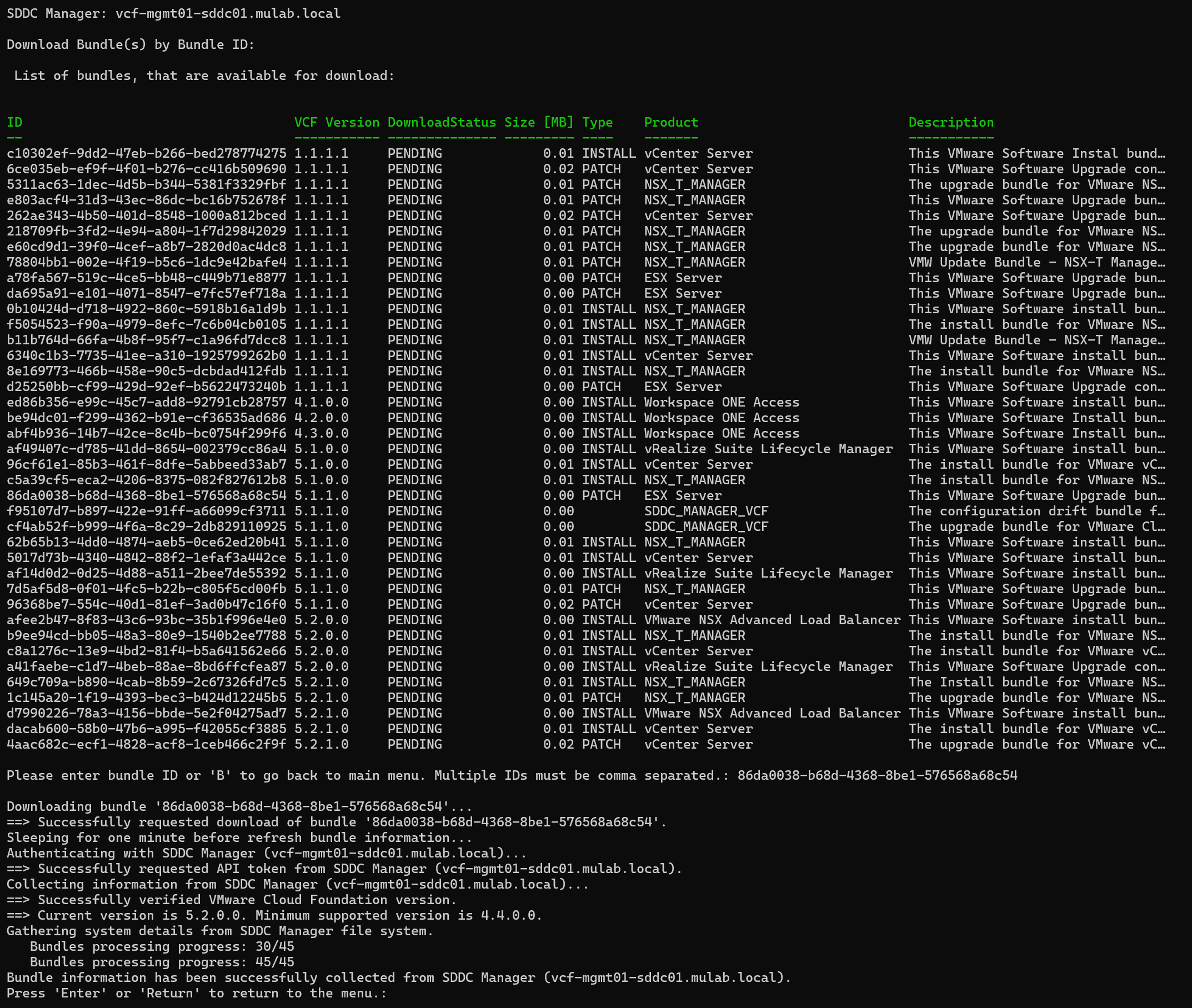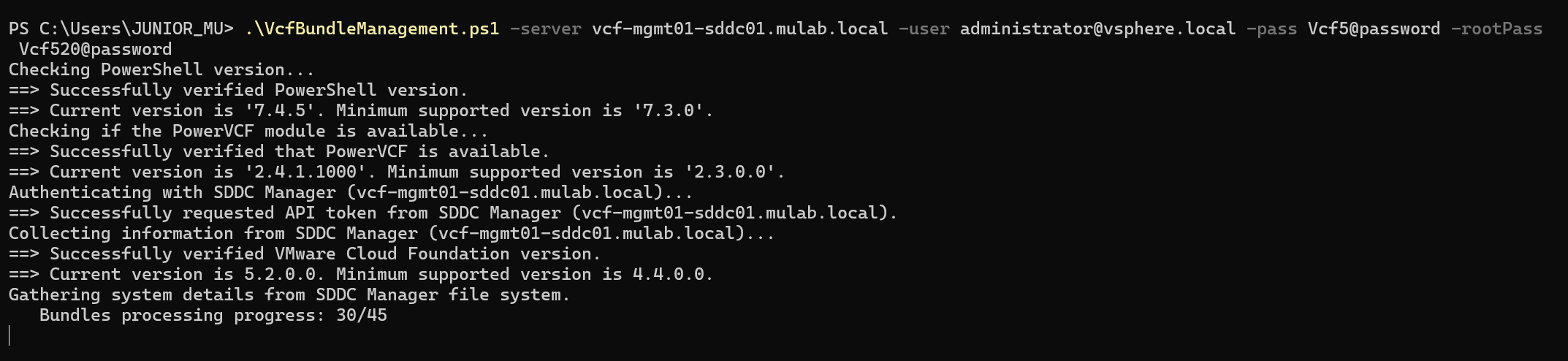 .\VcfBundleManagement.ps1 -server <SDDC_Manager_FQDN> -user <SDDC_Manager_SSO_User> -pass <SDDC_Manager_SSO_Password> -rootPass <SDDC_Manager_Root_Password>